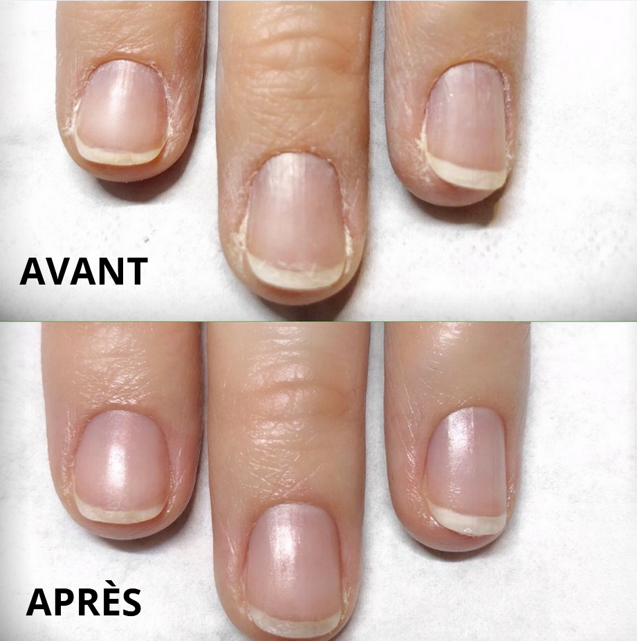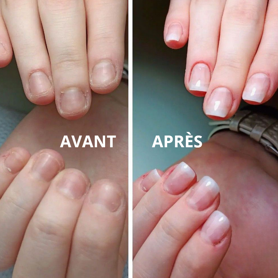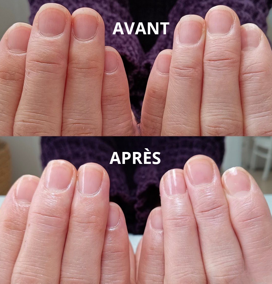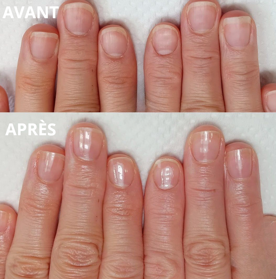 Ongles visiblement renforcés en quelques jours. La casse a nettement diminué et la surface est plus lisse.